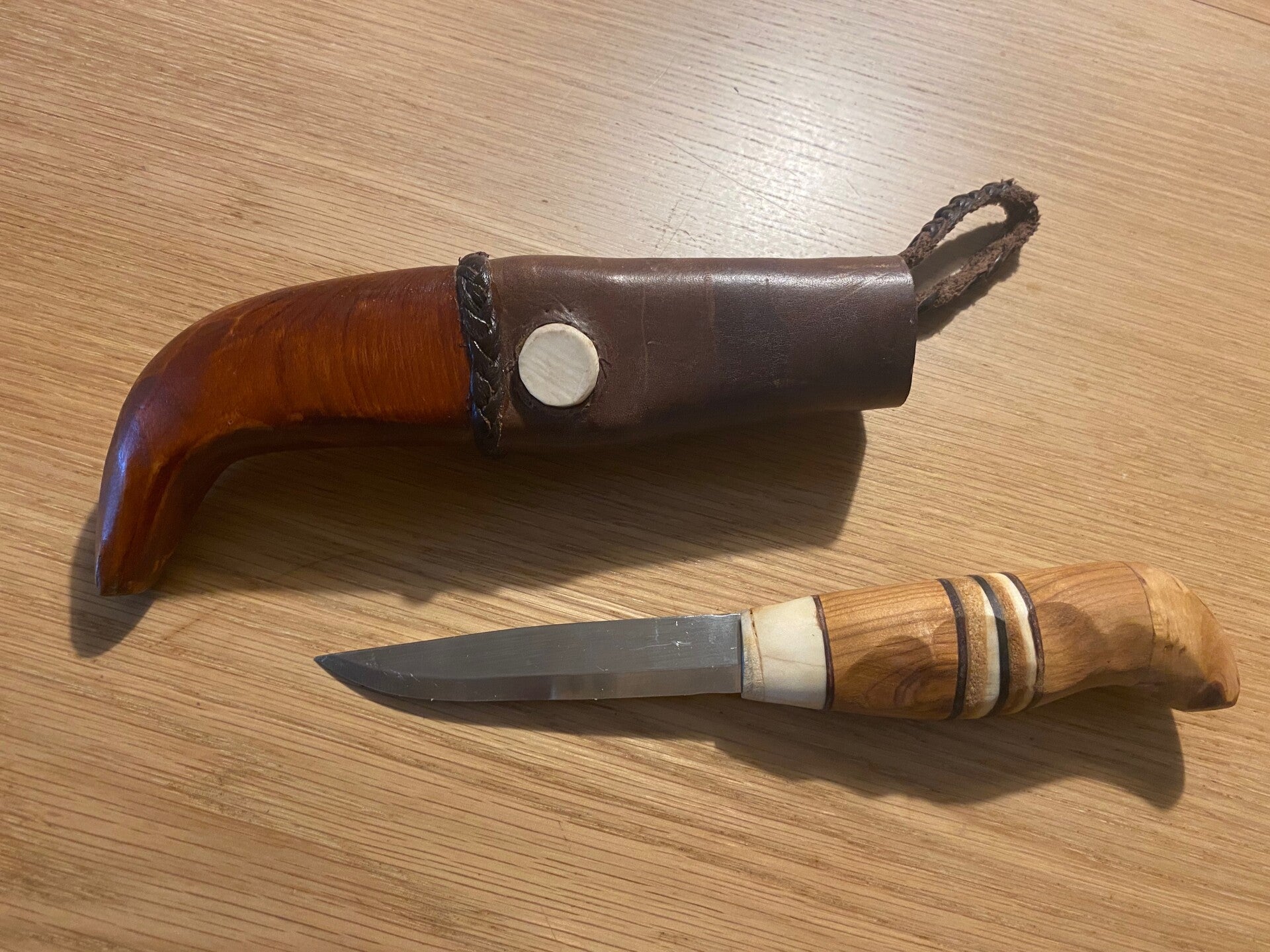 Mes 4 (foto 6-8): vintage mes Frosts uit Mora,Zweden met schede uit hout en leer en houten lemmet.
